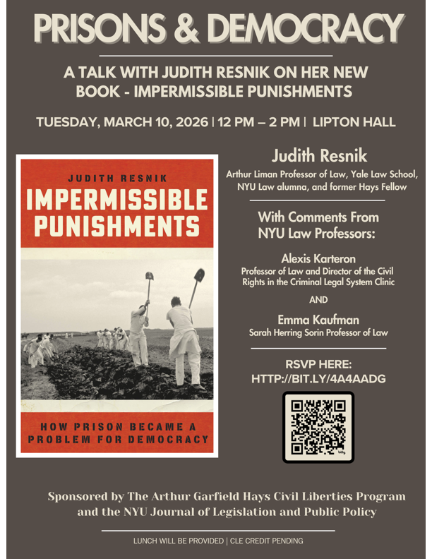 This symposium featured Professor Judith Resnik presenting her new book, Impermissible Punishments: How Prison Became a Problem for Democracy, which traces the origins of the corrections profession and the first international rules governing prisoner treatment adopted by the League of Nations in 1934 through World War II, the U.S. Civil Rights movement, and a landmark trial over the constitutionality of whipping in Arkansas in the 1960s. Bringing together the stories of those who designed punishment systems and those who lived under them, the book examines constitutional challenges to overcrowded cells, unsanitary conditions, violence, and prolonged isolation, as well as the global expansion of the prison industry and the ongoing push for abolition. Resnik argues that governments committed to equality cannot deliberately set out to destroy people and that many current forms of punishment need to end.
